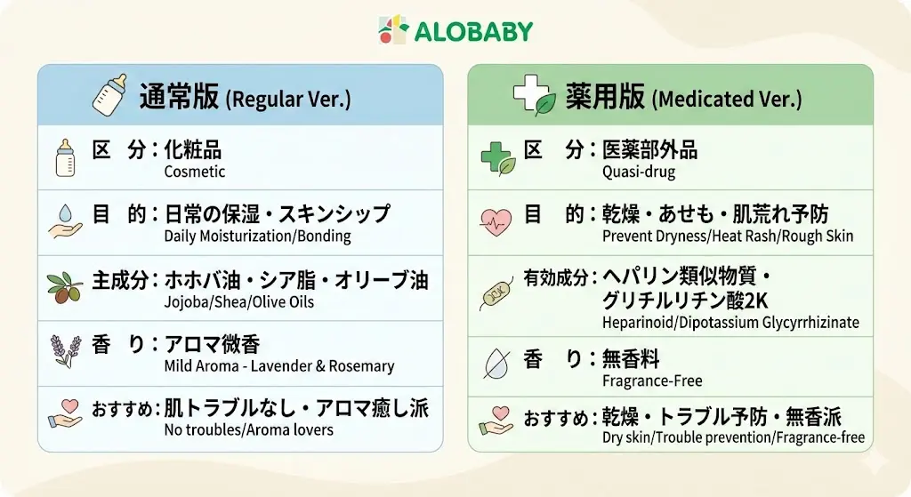 「アロベビーには種類があるけど、どっちを買えばいいの?」 実はアロベビー ミルクローションには、化粧品区分の「通常版」と、医薬部外品の「薬用版」が存在します。それぞれの成分特性を知ることで、赤ちゃんの肌状態に最適な一本を選べます。