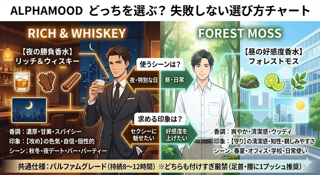 3. 「リッチ&ウィスキー」は夜・秋冬の勝負用、「フォレストモス」は昼・春夏・職場の好感度用。