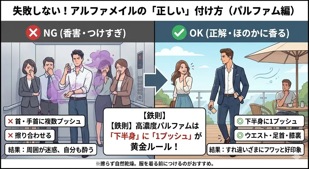 アルファメイル オム パフュームは、一般的な香水よりも濃度が高い「パルファム(賦香率20%以上)」です。 そのため、ドラッグストアで売っているライトな香水(オードトワレ)と同じ感覚でバシャバシャつけると、確実に「香害(スメハラ)」になります。
