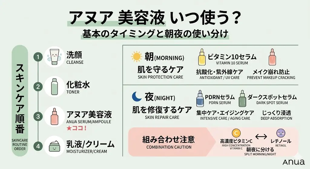 アヌアの美容液の効果をしっかり引き出すためには、肌の角質層へ的確に成分を届ける「タイミング」が重要です。ここでは、スキンケアのどの段階で投入すべきか、そして朝夜どちらに使うべきかの基本ルールを解説します。