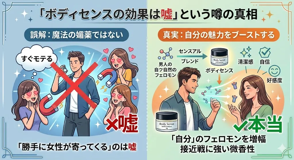 本記事では、ボディセンスの販売状況や最安値情報に加え、ネット上で囁かれる「効果は嘘なのでは?」という疑問の真相、そして気になる「どんな匂いなのか」「実際の女性の反応はどうなのか」について、徹底的な製品分析と愛用者の口コミをもとに詳しく解説します。