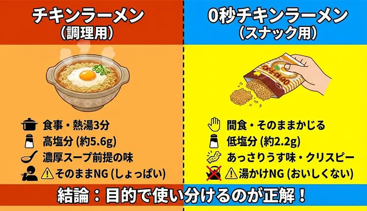 つまり、「0秒チキンラーメン」は、通常版の直食いが抱える健康リスク(塩分過多)を解消するために生まれた「進化版」なのです。単なるパッケージ変更品ではありません。