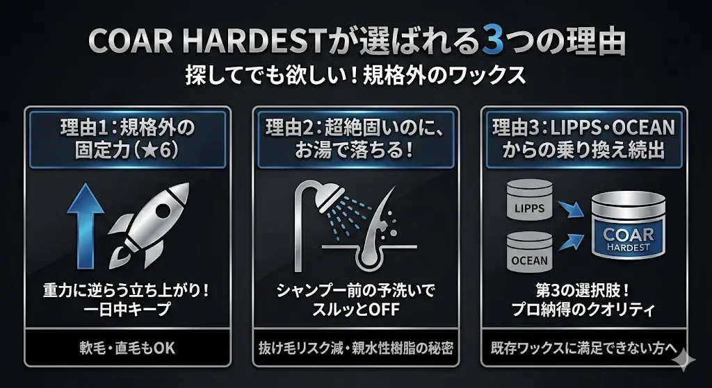 LIPPSやOCEANが築いた「使いやすさ」の土台の上に、「さらなる限界突破の固定力」と「将来の髪を守る洗い落ちの良さ」という強烈な付加価値を乗せたのがCOAR HARDESTです。「既存の有名ワックスでも夕方には崩れてしまう」「頭皮への負担が気になり始めた」という男性にとって、まさに理想的な「第3の選択肢」となっています。