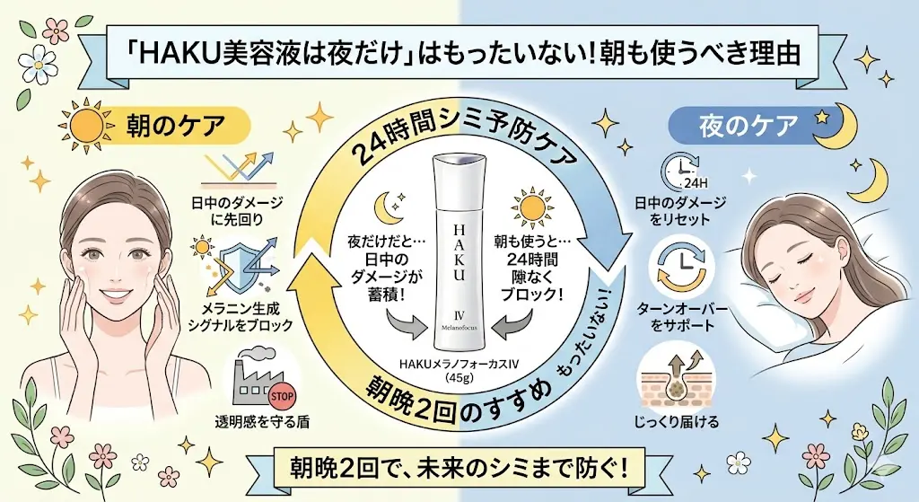 朝のスキンケアでHAKUを使用することは、これから受ける日中のダメージを先回りしてブロックする「強力な盾」を仕込むことを意味します。夜だけの使用では、日中に浴びたダメージの後追いケアになってしまうため、24時間体制でシミ予防を行うのが最も確実なアプローチです。