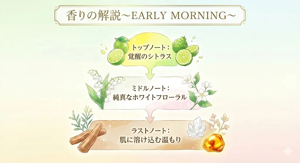 「EARLY MORNING」という名前が示す通り、この香水は「朝の光」「目覚めの清々しさ」をテーマにしています。具体的にどのような香料が使われ、どのように変化するのかを見ていきましょう。