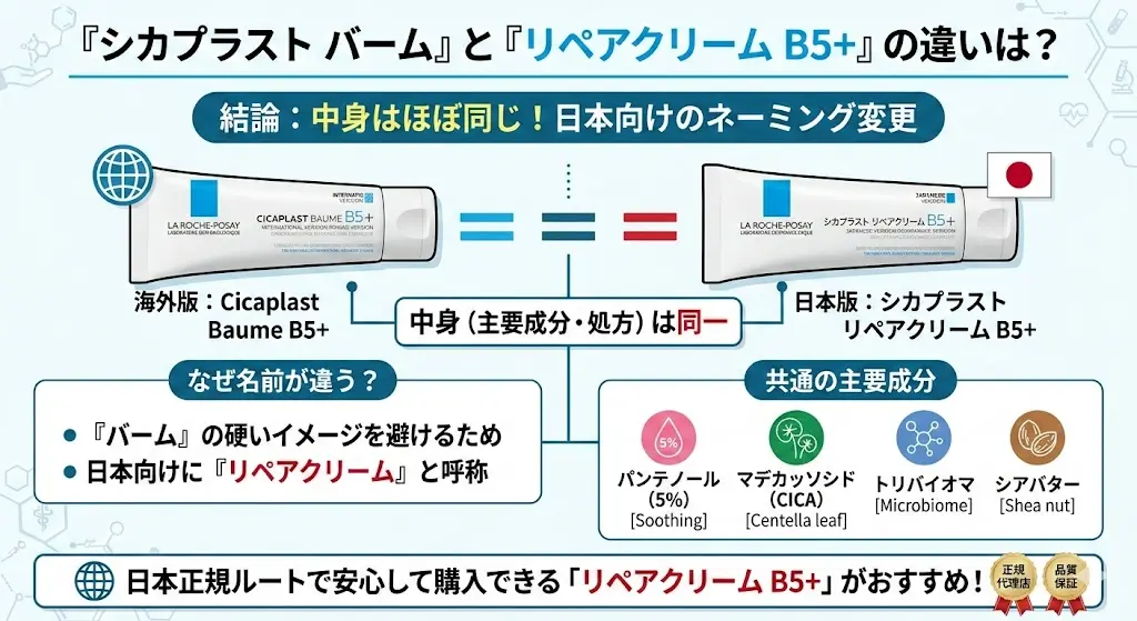 海外の美容系掲示板(Redditなど)や過去のSNS投稿では「Cicaplast Baume B5+(シカプラスト バーム B5+)」という名前で絶賛されています。そのため、日本の店頭で「シカプラスト リペアクリーム B5+」を見かけた際、「名前が違うけれど同じもの?」「日本版は処方が違って効果が薄いのでは?」と不安に感じる方が少なくありません。