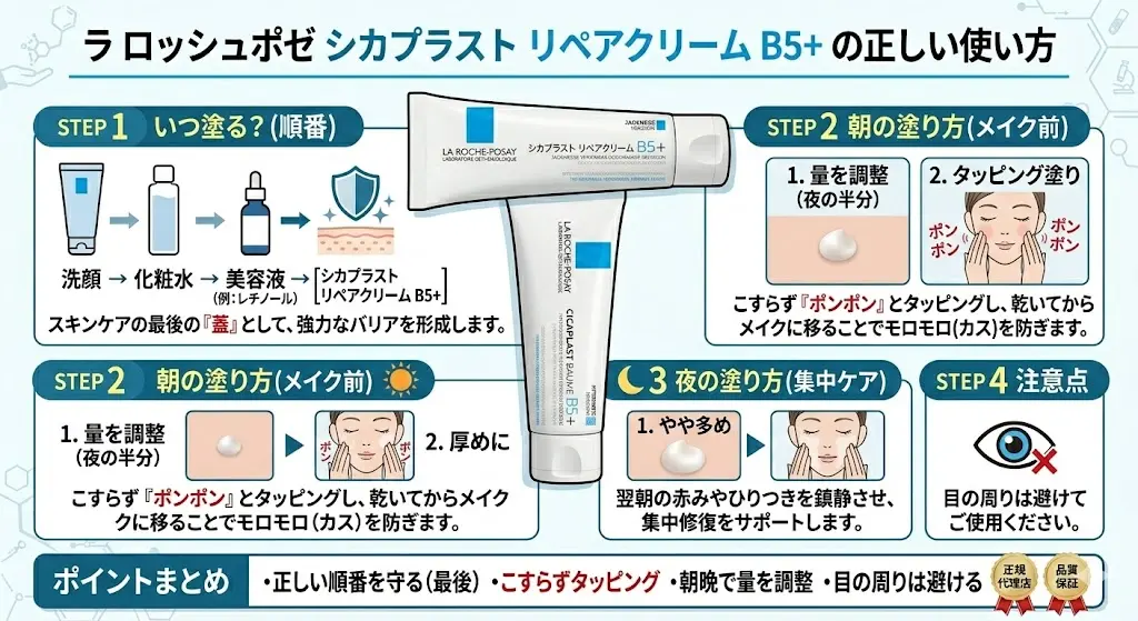 せっかく優秀なクリームを手に入れても、使い方が間違っていると「インナードライが悪化した」「メイクがヨレる」といった不満につながってしまいます。本製品は一般的な保湿クリームとは異なる「特殊なバリア設計」を持っているため、正しい使い方をマスターすることが重要です。