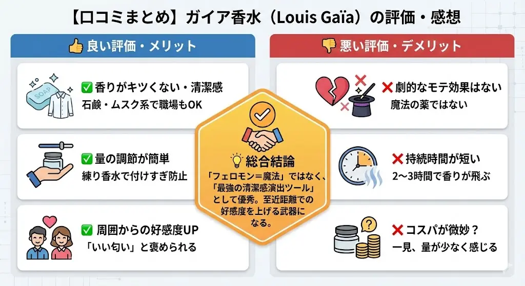 「フェロモン香水」という言葉には、どうしても怪しさがつきまといます。「本当に効果があるのか?」「サクラの口コミじゃないのか?」と疑うのは当然です。 ここでは、ルイガイアを実際に使用したユーザーの声を、良い面(メリット)だけでなく、悪い面(デメリット・注意点)も含めて公平に分析します。