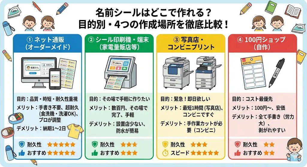 いざという時に困らないよう、名前シールを作れる主な4つの場所と、それぞれのメリット・デメリットを整理しました。ご自身のスケジュールと予算に合わせて最適な方法を選びましょう。